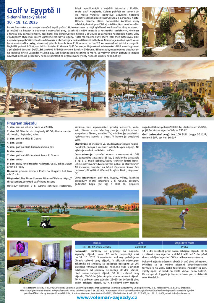Golf v Egyptě II 2025 16. 10. 2025 10. – 18. 12. 20259-denní letecký zájezdZákladní cena: 24 990 Kč/osProgram zájezdu ZDEObsazeno. Souvisejicí Golf v Abú Dhabí 20. 10. 2025| Archiv Golf na Mallorce 2025 8. 9. 2025| Archiv Plán výuky – Podzim 2025 14. 7. 2025| Archiv
